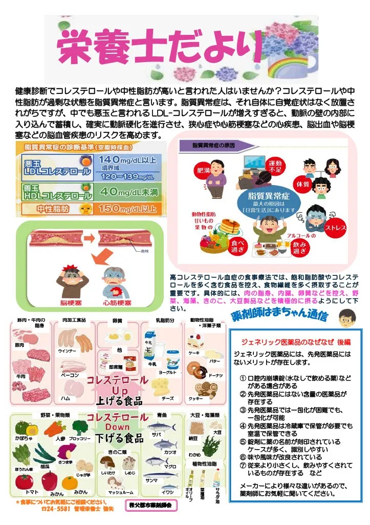 栄養士だより コレステロールや中性脂肪が高いと言われたら 栄養士だより2025年5月号第40号です。健康診断でコレステロールや中性脂肪が高いと言われた人はいませんか?コレステロールや中性脂肪が過剰な状態を脂質異常症と言います。脂質異常症は、それ自体に自覚…